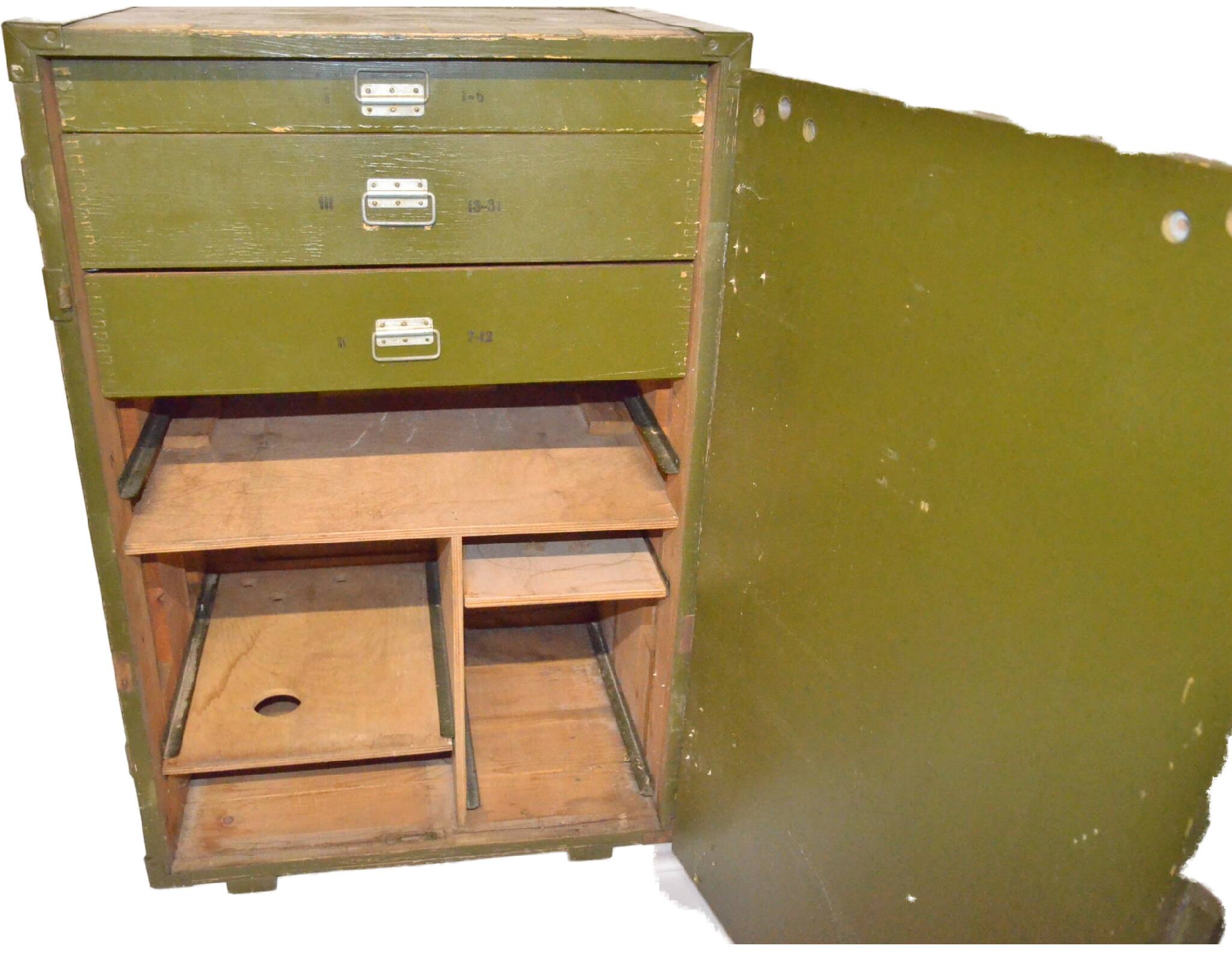 Beschreibung: Zum öffnen, 2 Griffen, verschliessbar, mit Fächern und Schubladen - aus russischem oder NVA Bestand.
