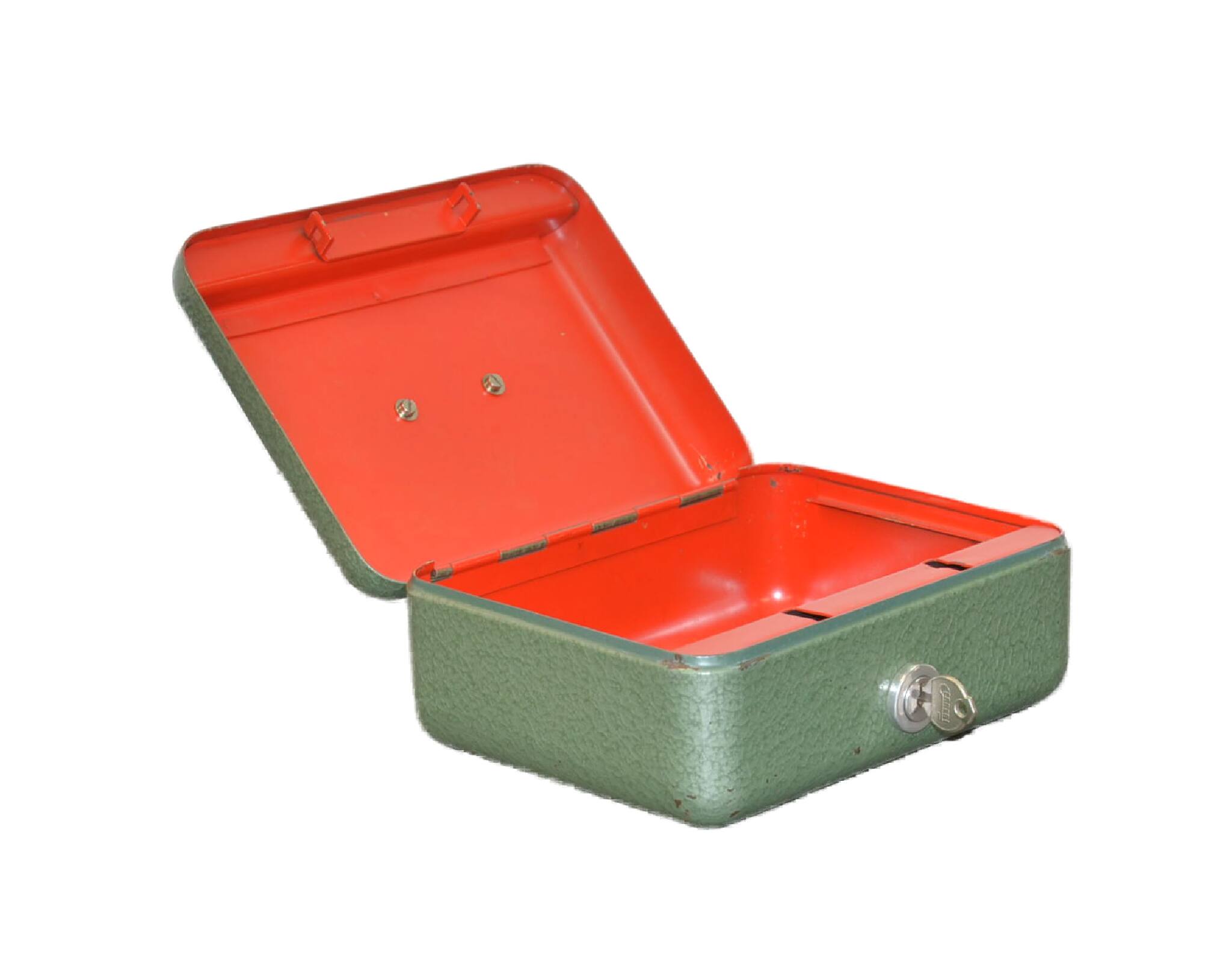 Beschreibung: Geldkassette mit Schlüssel abschliessbar, Eisen, Hammerschlag, grün