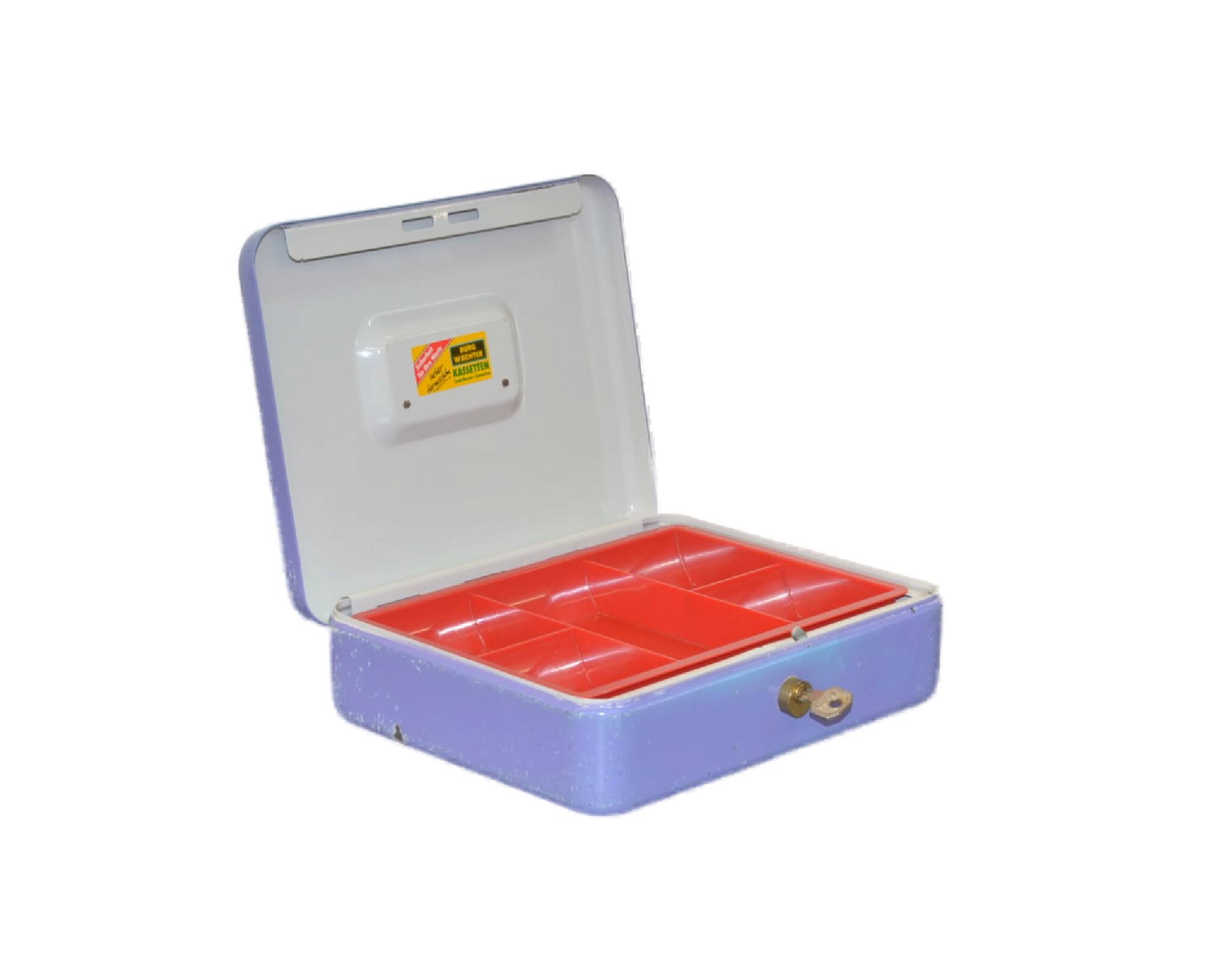 Beschreibung: Geldkassette mit Schlüssel, abschliessbar, Eisen, Stahl, blau mit Einsatz