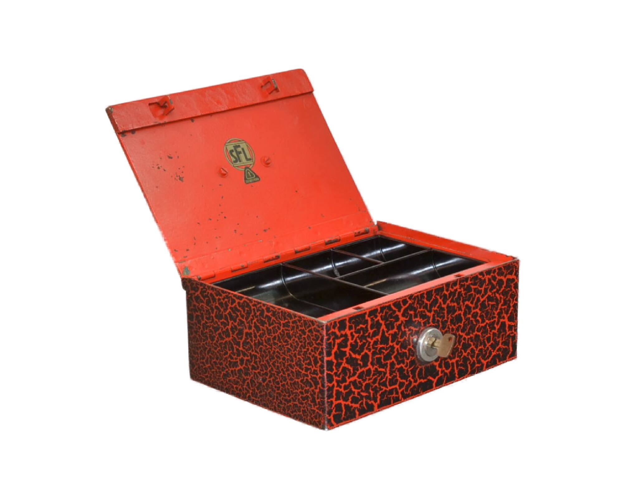 Beschreibung: Geldkassette mit Schlüssel, abschliessbar, Eisen, rot braun marmoriert mit Einsatz