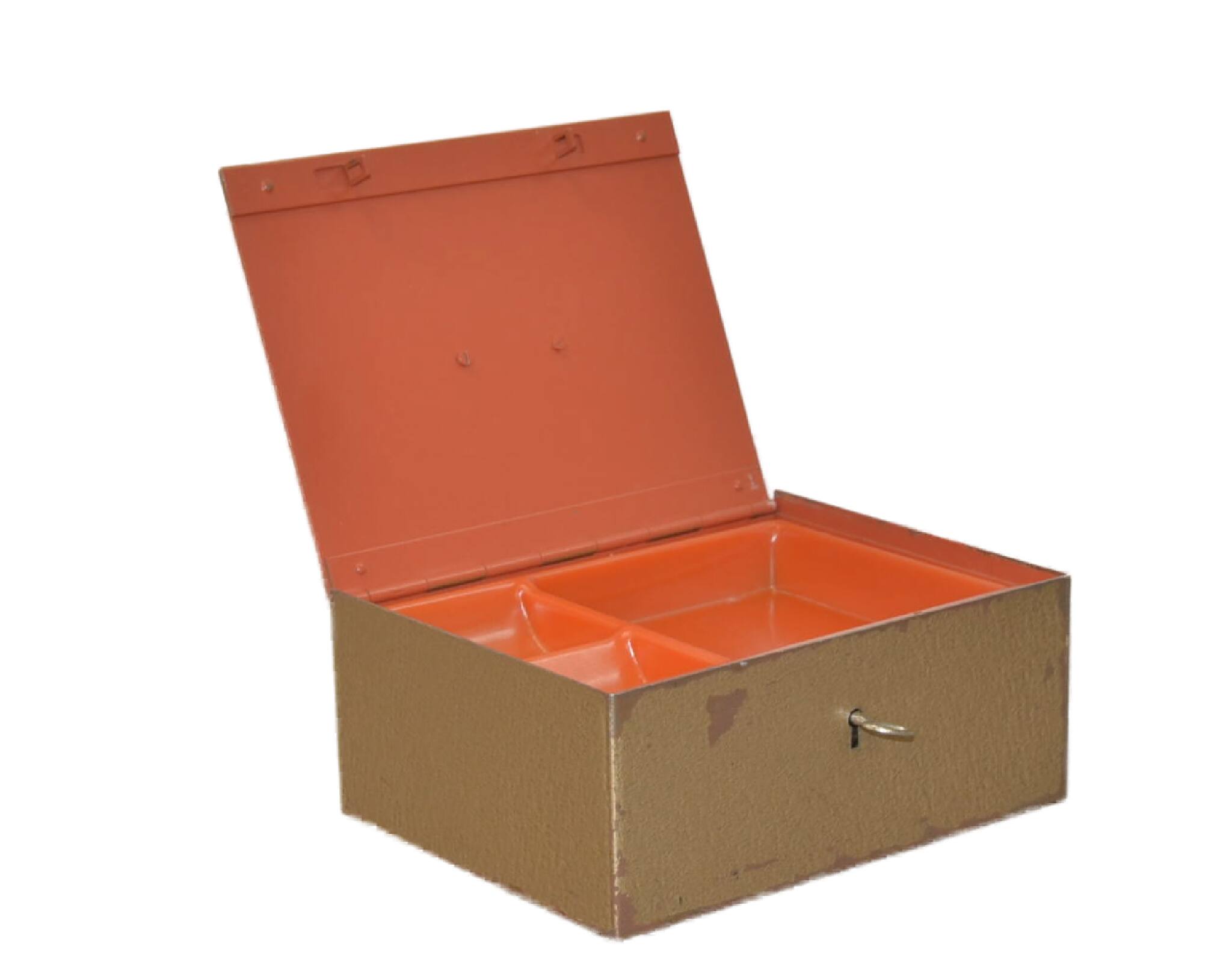 Beschreibung: Geldkassette mit Schlüssel, abschliessbar, Eisen, Hammerschlag braun mit Einsatz, Gebrauchsspuren
