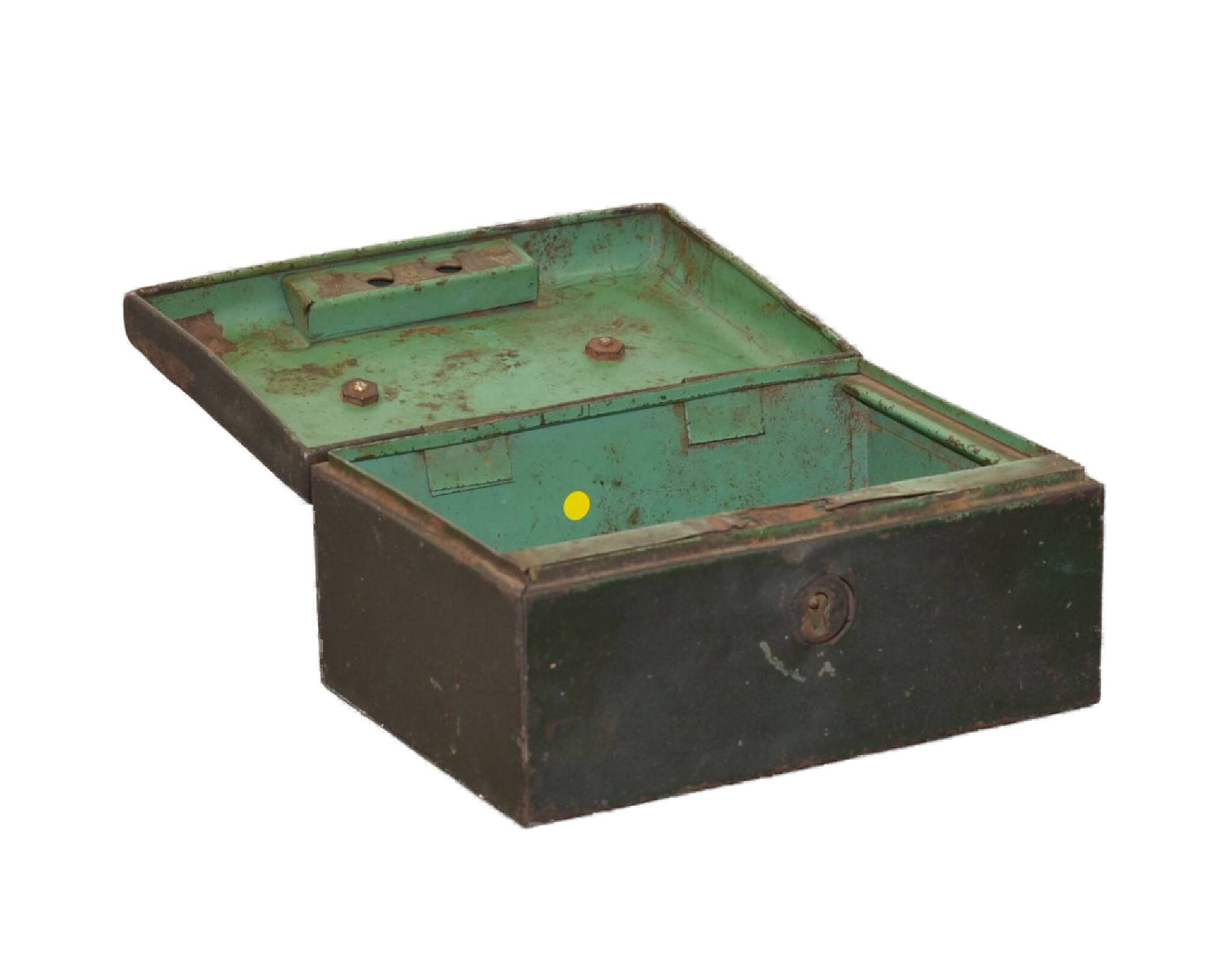 Beschreibung: Geldkassette ohne Schlüssel, offen, verrostet, alt, braun, kein Einsatz