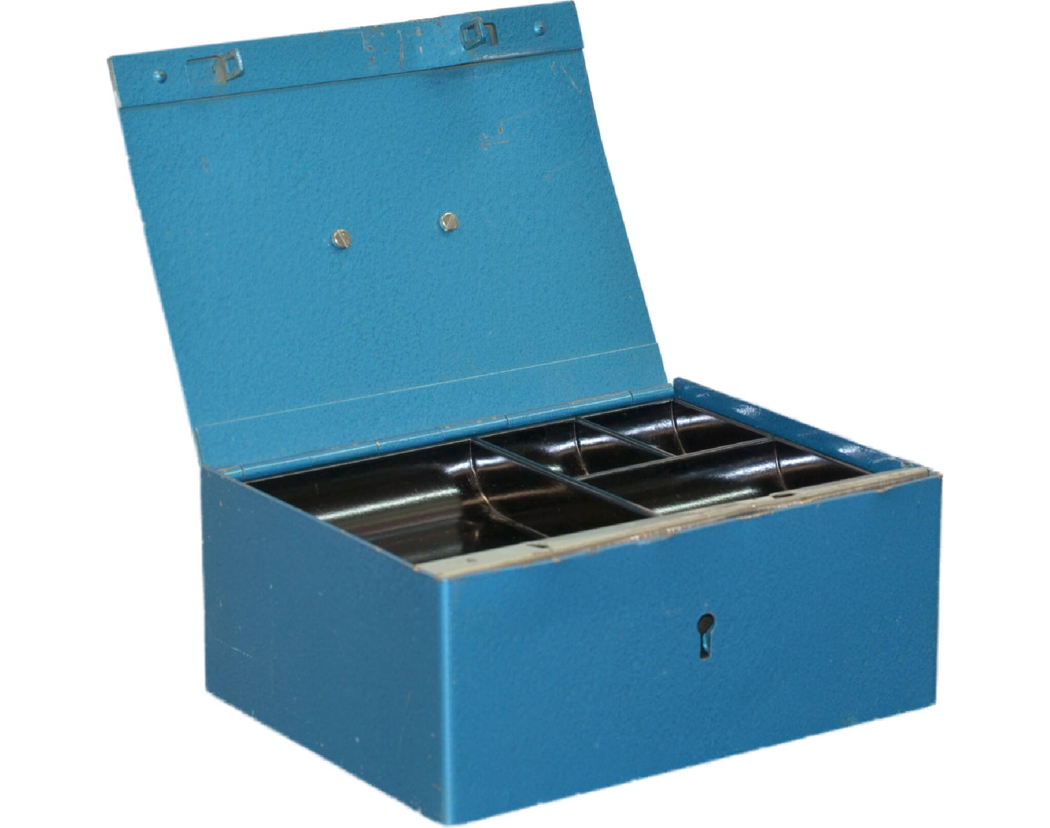 Beschreibung: Geldkassette aufgebrochen, ohne Schlüssel, Stahl, Hammerschlag, blau
