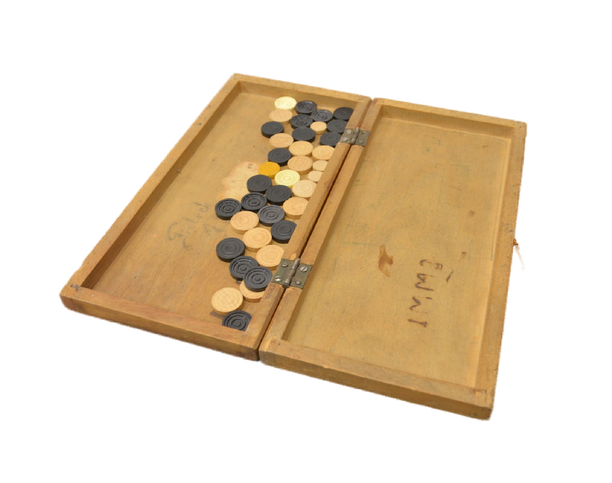 Beschreibung: Damespiel aufklappbar Holzbox, mit Dame Figuren, Gesbrauchsspuren